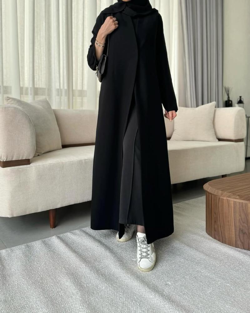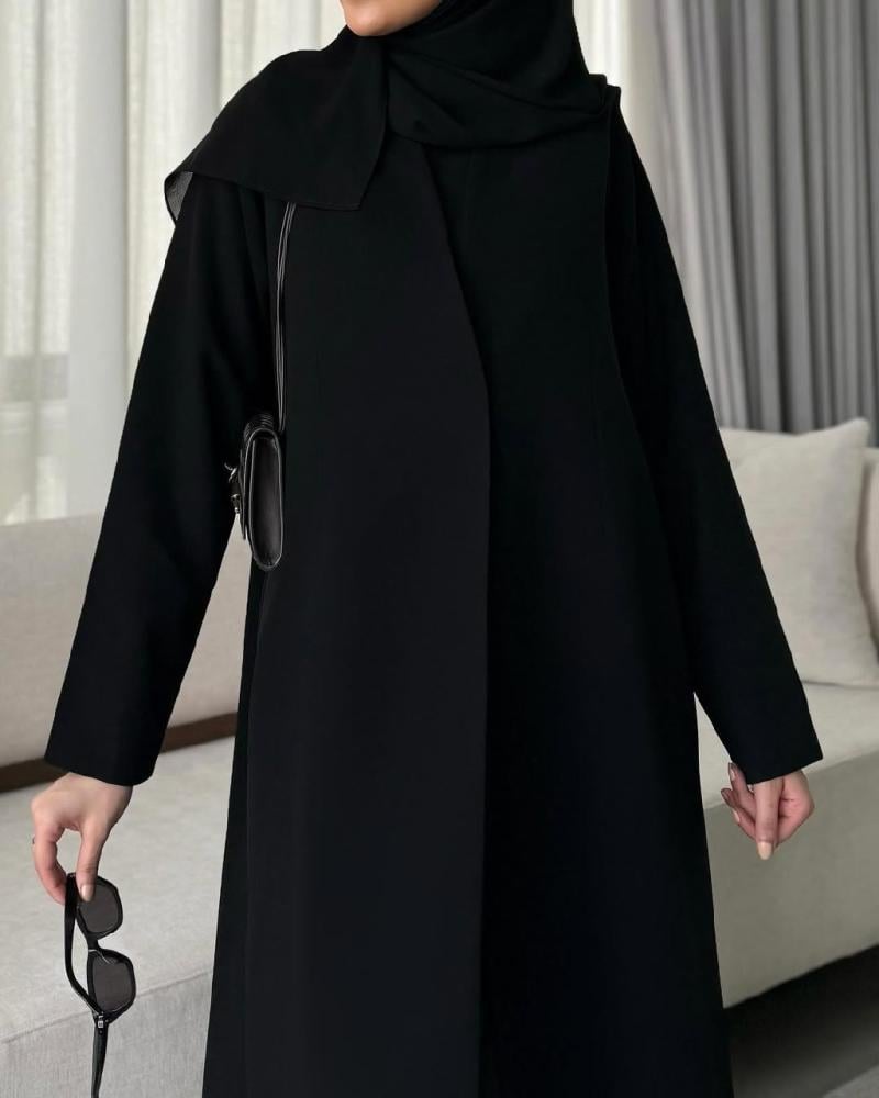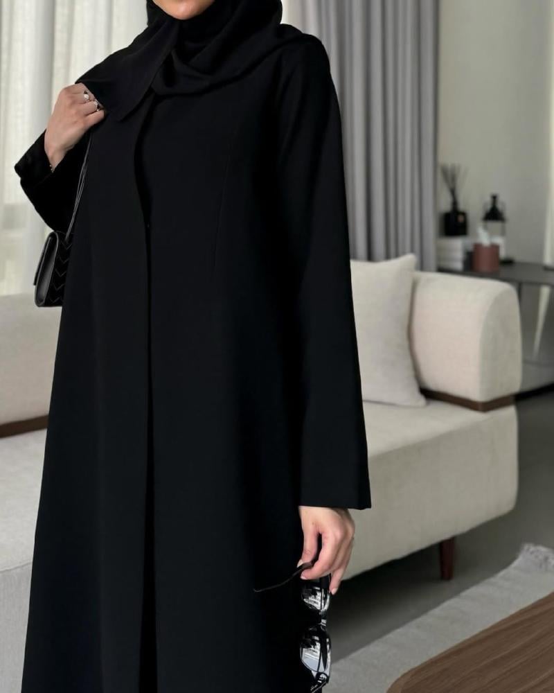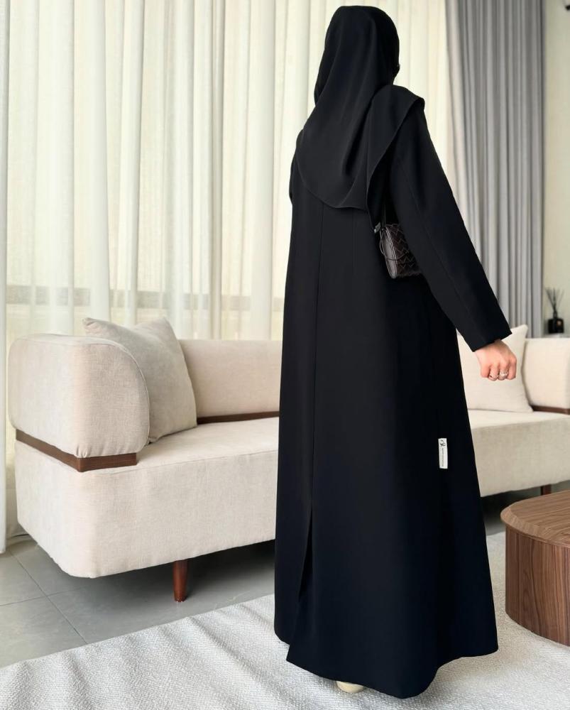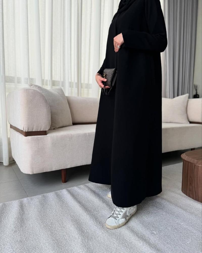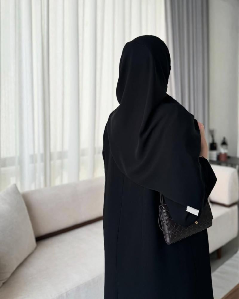 عباية بستايل البليزر بس بياقة سادة حدها رزة باللبس وقصتها سيدة مو كلوش والحلو فيها تقدرين تنسقين معاها ستايل سبورت او ستايل عملي